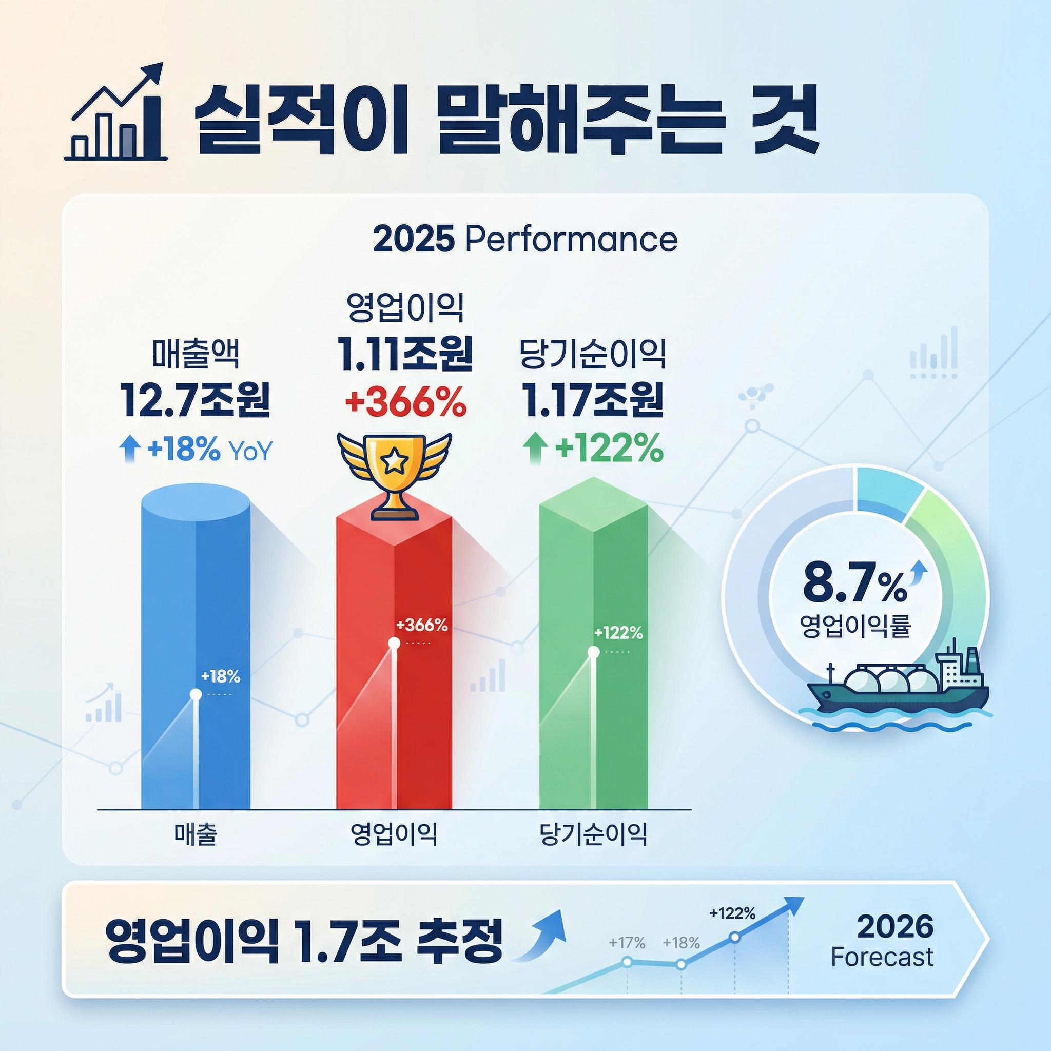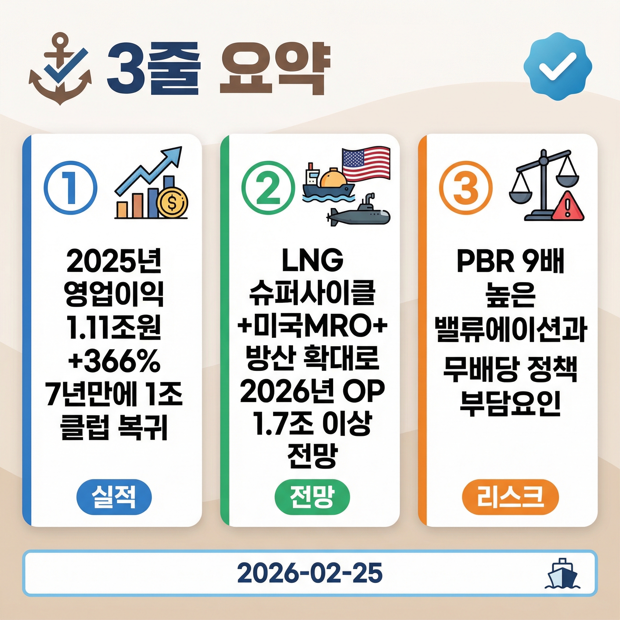 2️⃣ LNG 슈퍼사이클 + 미국 MRO + 방산 확대로 2026년 OP 1.7조 원 이상 전망돼요.