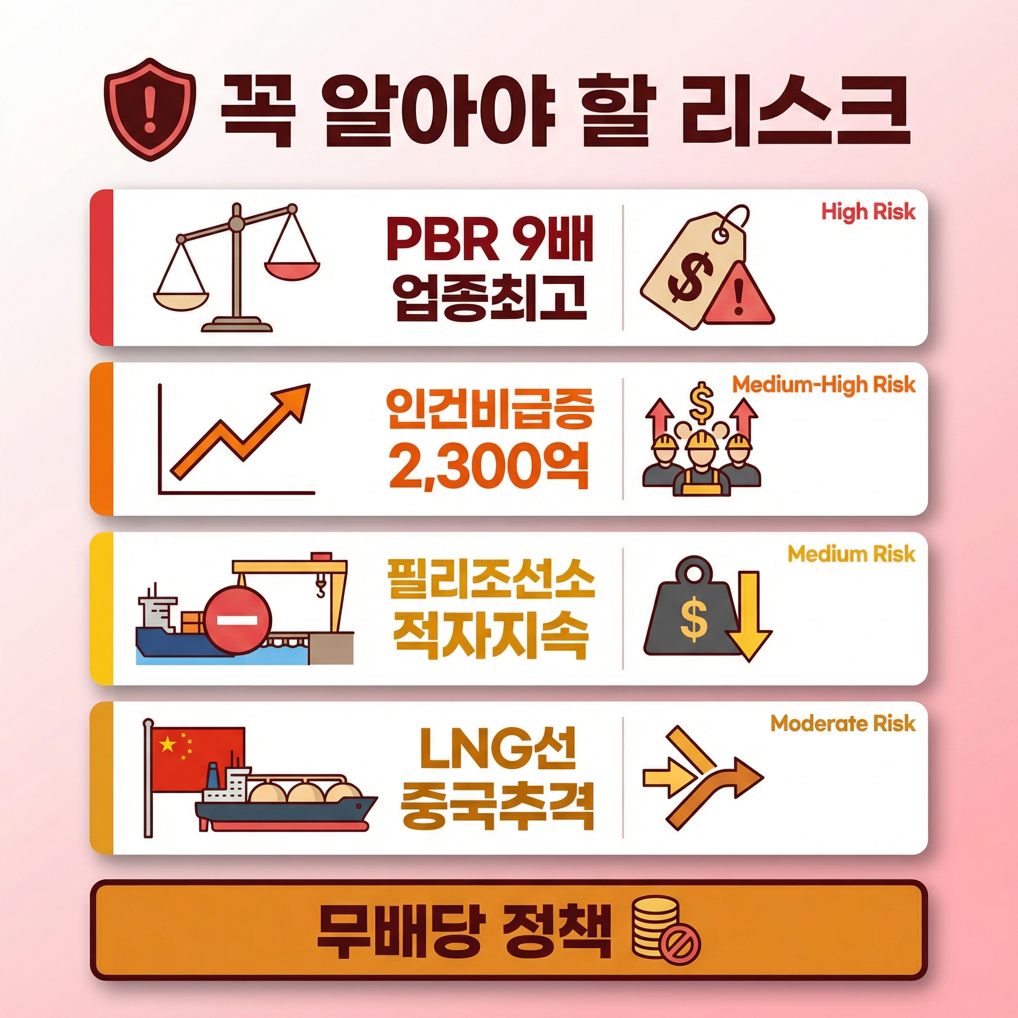 🔴 높은 밸류에이션 (PBR 9배, 업종 최고) · 🟡 인건비·성과급 급증 (4Q25에 2,300억 반영) · 🟡 미국 필리조선소 적자 지속 · 🟡 중국 LNG선 추격