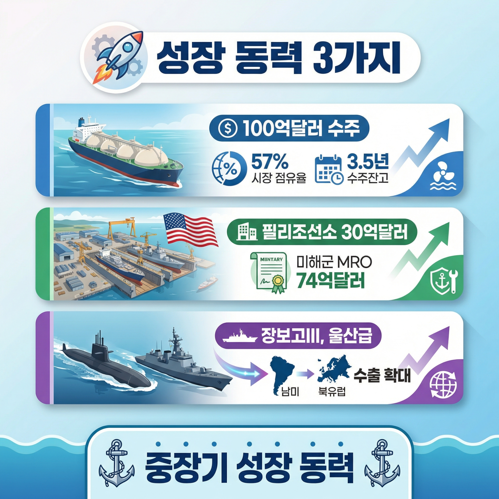 셋째, 방산 특수선 확대예요. 장보고-III 잠수함, 울산급 호위함 건조가 순조롭게 진행 중이에요. 남미, 북유럽 수출까지 논의 중이라 중장기 성장 동력으로 주목받고 있어요. 💡