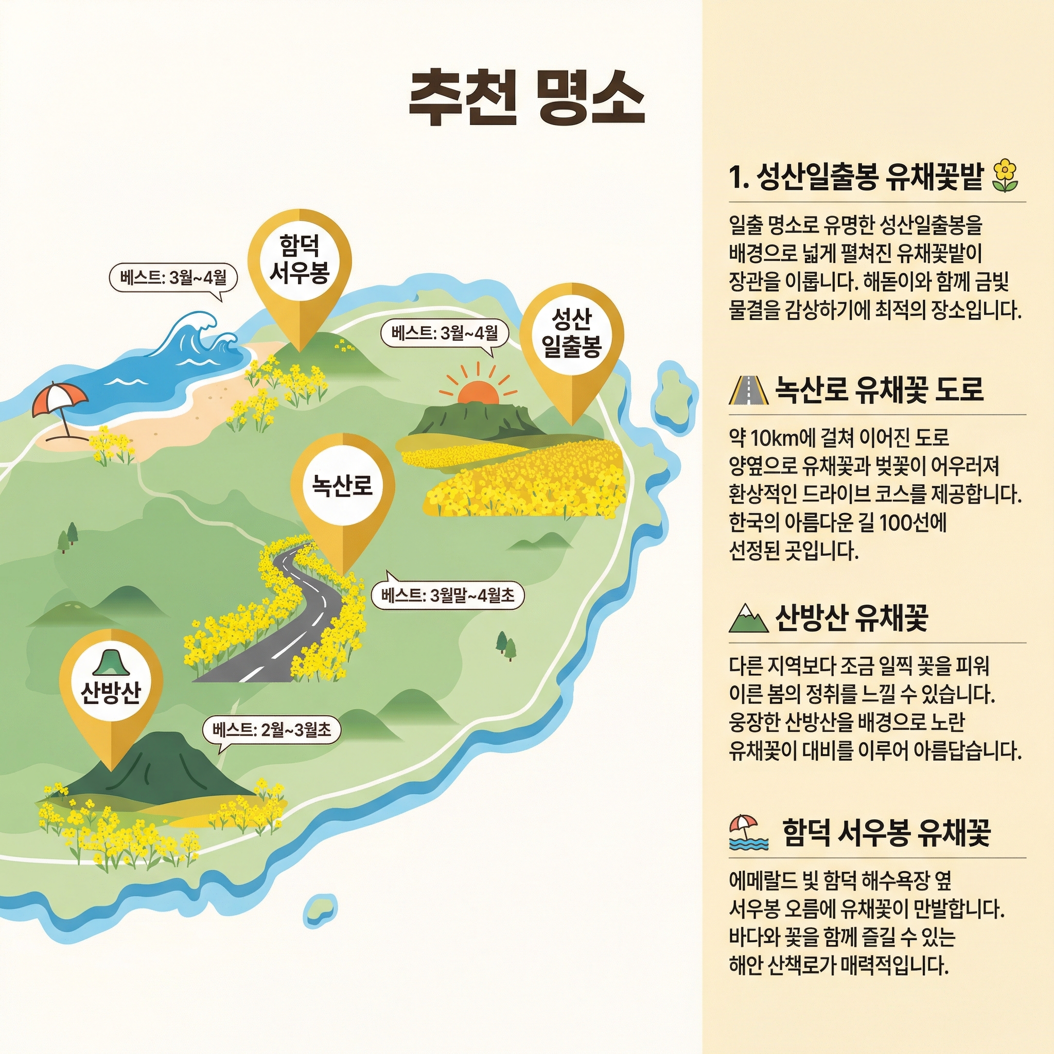 2️⃣ 1~2월은 산방산·성산일출봉 중심, 3월은 제주 전역, 4월은 중산간·녹산로 중심