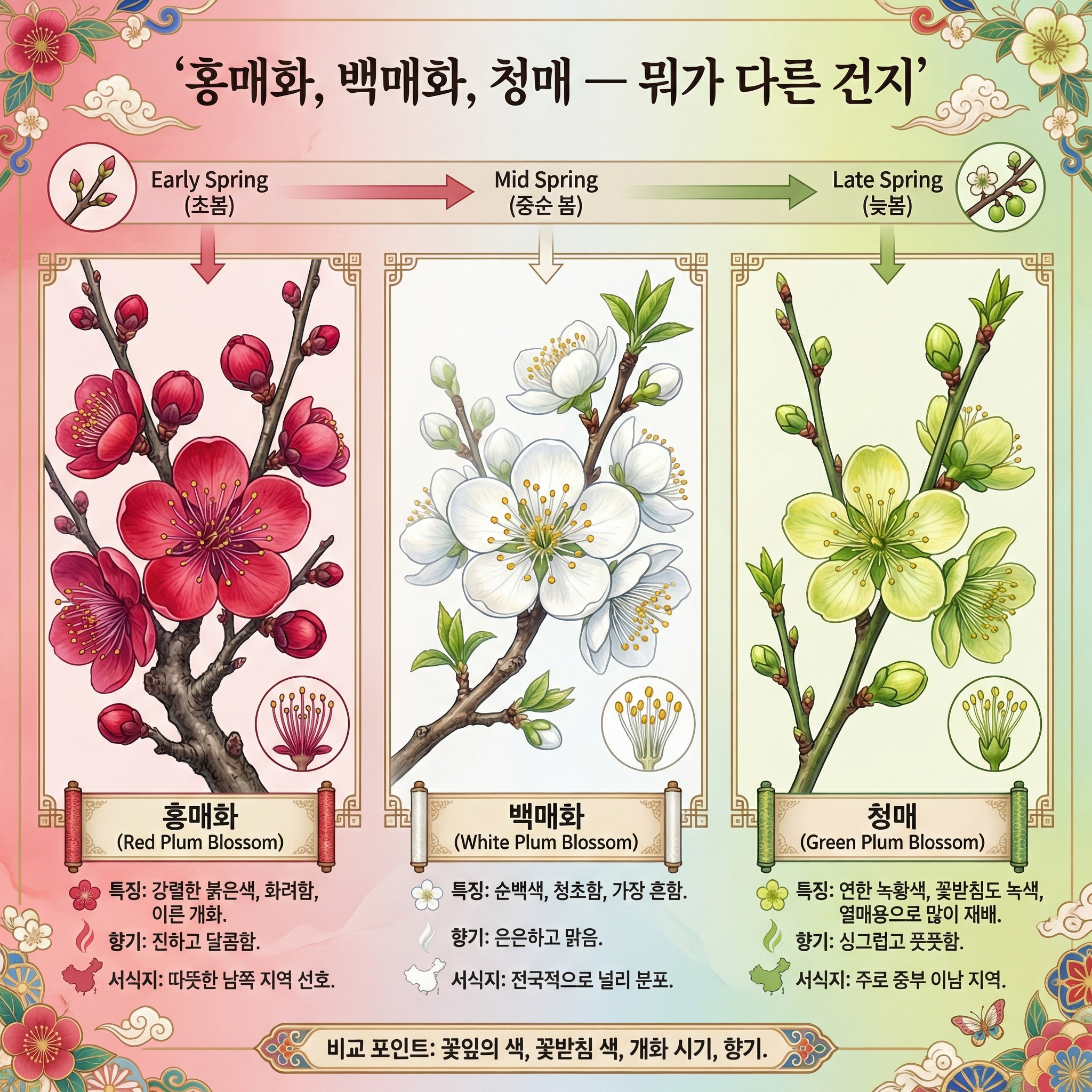 2️⃣ 홍매화 → 백매화 → 청매 순서로 피니까 시기에 따라 볼 수 있는 품종이 달라요.