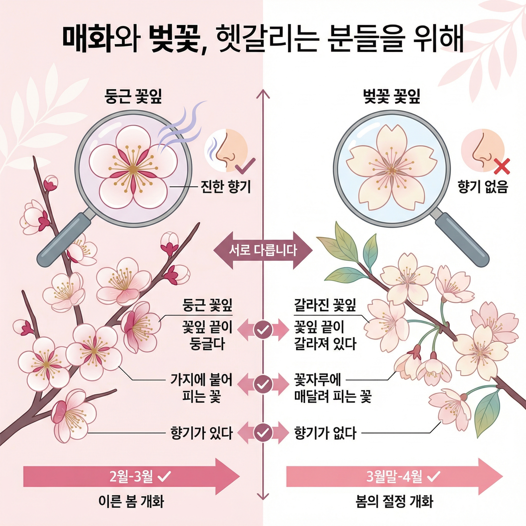 A. 매화는 꽃잎 끝이 둥글고 은은한 향이 나요. 벚꽃은 끝이 갈라져 있고 향이 거의 없어요. 개화 시기도 매화가 한 달 정도 빨라요.