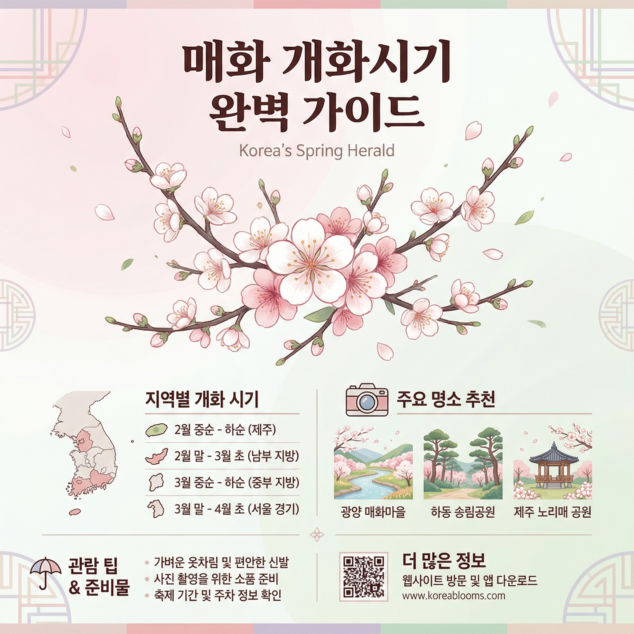 3️⃣ 광양매화축제는 3월 13~22일, 양산 원동은 3월 7~8일 — 각 지자체 SNS에서 실시간 개화율 확인 필수.