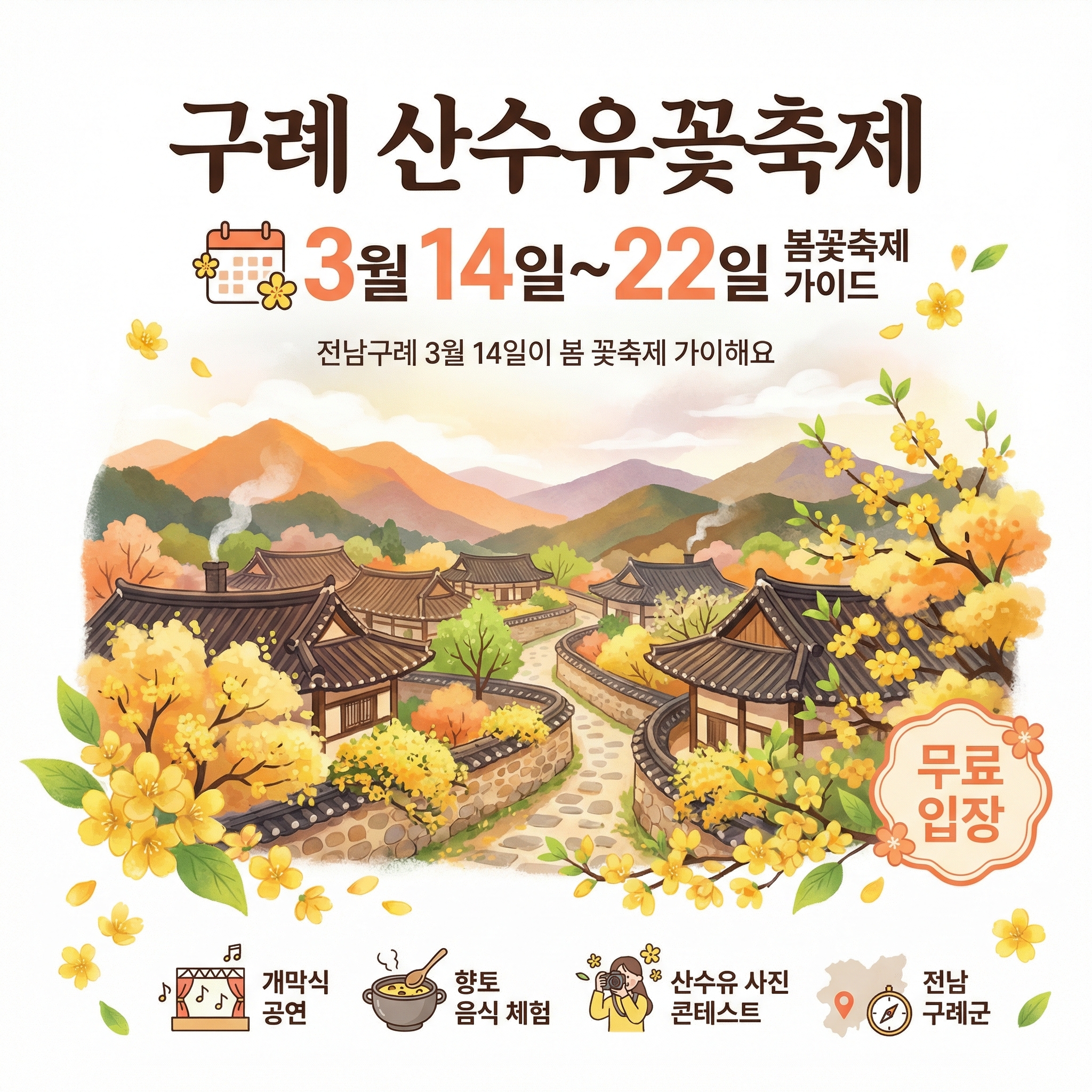 올해 제27회 구례 산수유꽃축제 일정이 확정됐어요. 주차장이 어딘지, 셔틀버스는 어떻게 타는지, 가서 뭘 봐야 하는지 정리해봤어요.