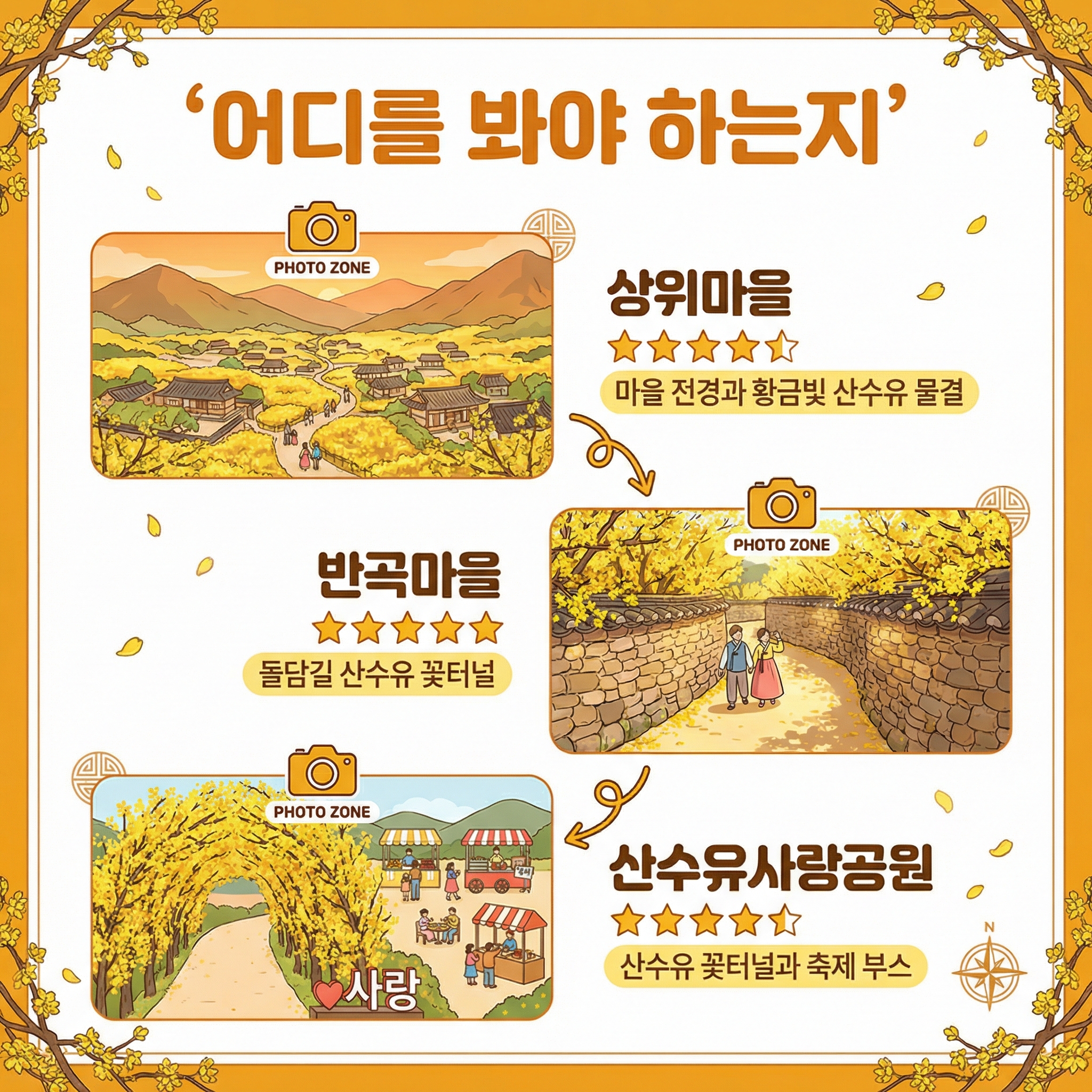 추천 동선은 상위마을에서 시작해서 하위마을, 반곡마을, 산수유사랑공원 순으로 내려오는 거예요. 높은 데서 낮은 데로 내려오면서 보면 체력 소모가 덜해요.