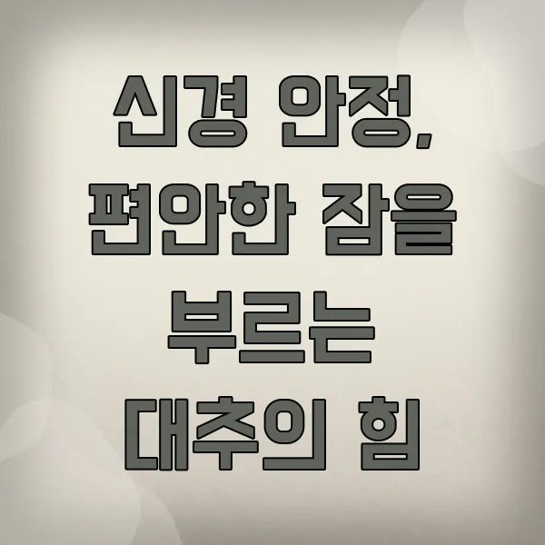 "잠이 보약이다"라는 말이 있죠. 충분한 수면은 우리 몸과 마음의 회복에 필수적인데요. 대추에는 세로토닌, 갈락토스, 수크로스 같은 성분들이 풍부하게 들어있어요. 이 성분들이 뇌를 차분하게 가라앉히고, 긴장되어 있던 근육을 부드럽게 풀어주는 역할을 하거든요. 그래서 스트레스로 지친 현대인들에게는 마음을 다스리고 긴장을 완화하는 데 도움을 줄 수 있답니다. 꾸준히 챙겨 드시면 복잡한 생각으로 잠 못 이루던 밤이 좀 더 편안해질지도 모르겠어요.