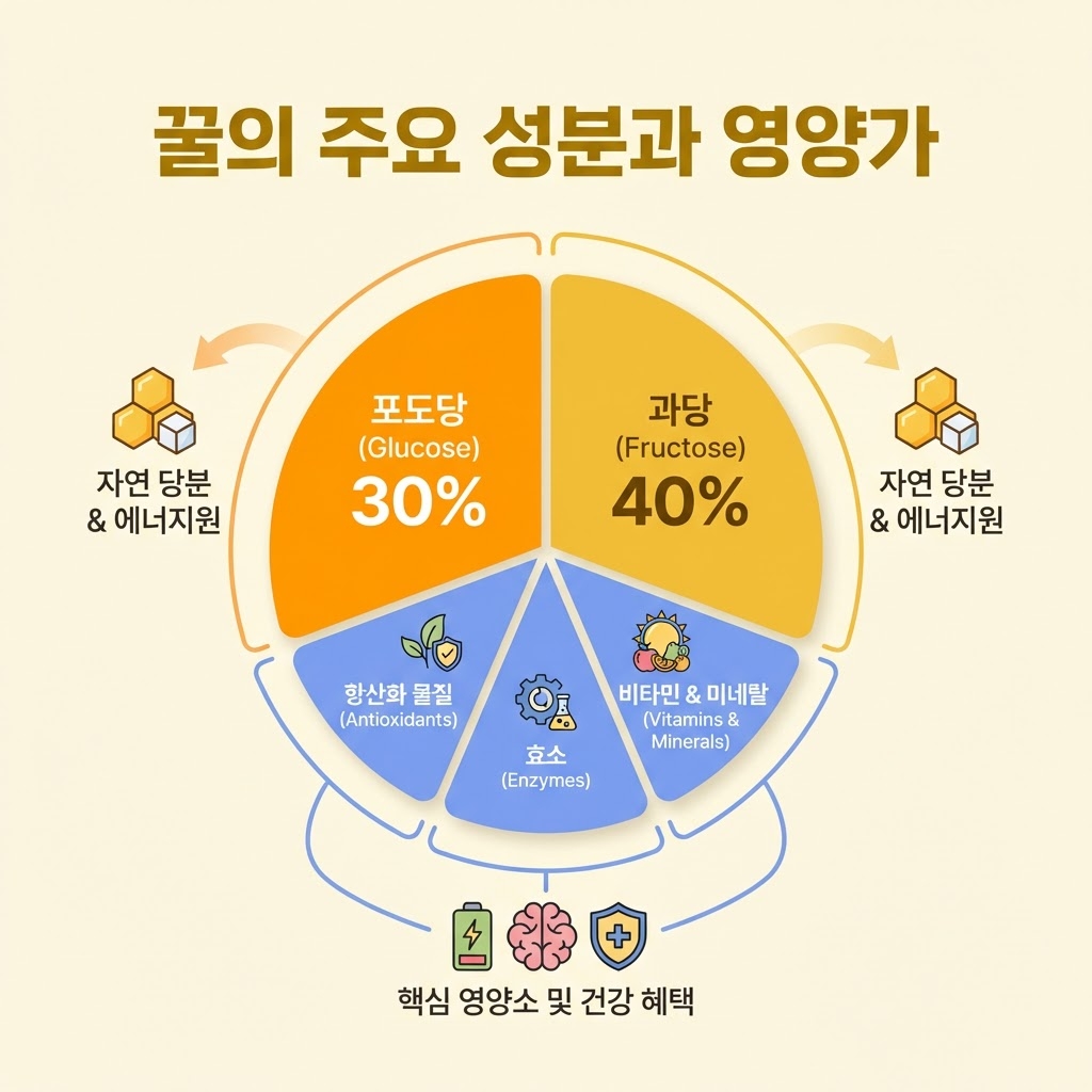 꿀의 약 70% 이상이 당분이에요. 💪 하지만 흰 설탕과는 다른 포도당과 과당으로 이루어져 있어서 우리 몸이 다르게 흡수한다고 알려져 있습니다.