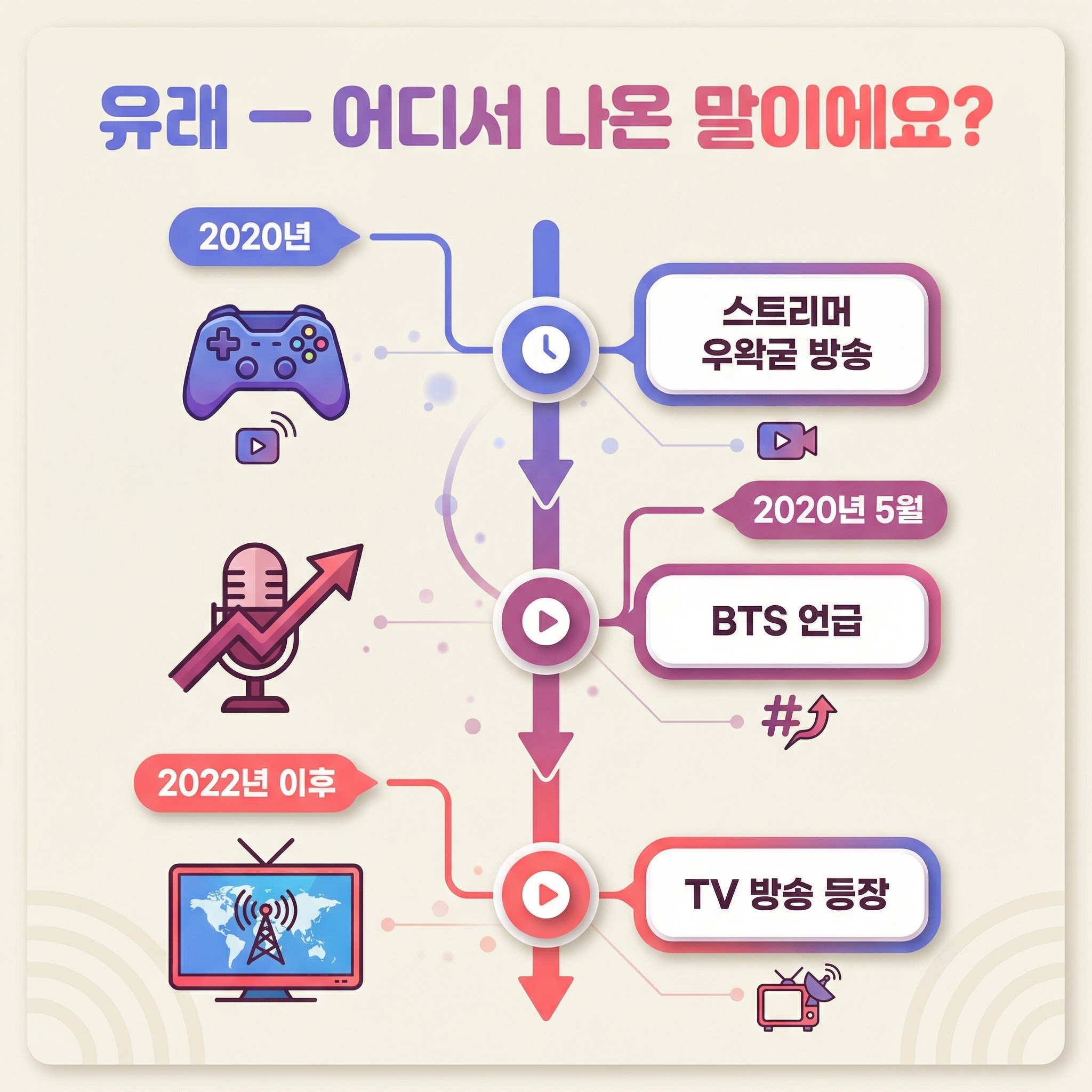 처음에는 팬들 사이에서만 쓰던 일종의 내부 유행어였어요. 🎮 그런데 점점 퍼져나가면서 방송 밖으로 나오기 시작했죠.